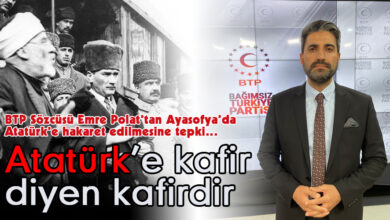 Bağımsız Türkiye Partisi (BTP) Sözcüsü Emre Polat Ayasofya’da Atatürk’e hakaret edilmesine tepki gösterdi. Basın açıklaması yapan Polat, “Gazi Mustafa Kemal…