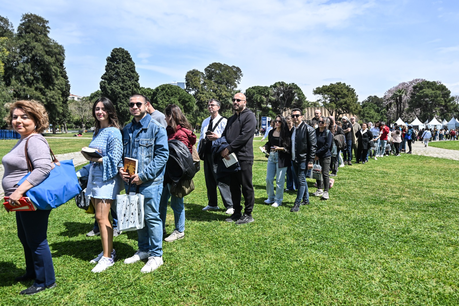 İzmir Büyükşehir Belediyesi’nin ev sahipliğinde, İZFAŞ ve TACT Fuarcılık iş birliğiyle 17-26 Nisan tarihleri arasında Kültürpark’ta düzenlenen İZKİTAP – 7. İzmir Kitap Fuarı, yayınevleri, sahaflar, eğitim ve kültür kurumları ile sivil toplum kuruluşlarını bir araya getirirken; yaklaşık 200 katılımcı ve 400’e yakın yazar, şair, gazeteci ve akademisyeni okurlarla buluşturuyor. Fuar kapsamında söyleşi ve imzalarla birlikte toplamda 500’e yakın etkinlik düzenleniyor. Fuarın ikinci gününde, hafta sonu güzel havayı da fırsat bilen kitapseverler, Kültürpark’ı doldurdu. Öğrenciler, çocuklarıyla birlikte fuara gelen aileler, her yaştan İzmirli, edebiyatla dolu bir gün yaşadı. Özellikle söyleşi alanları ve imza stantlarında kuyruklar oluştu. Okurlar hem sevdikleri yazarlarla bir araya gelme hem de yeni yayımlanan kitapları keşfetme fırsatı buldu.