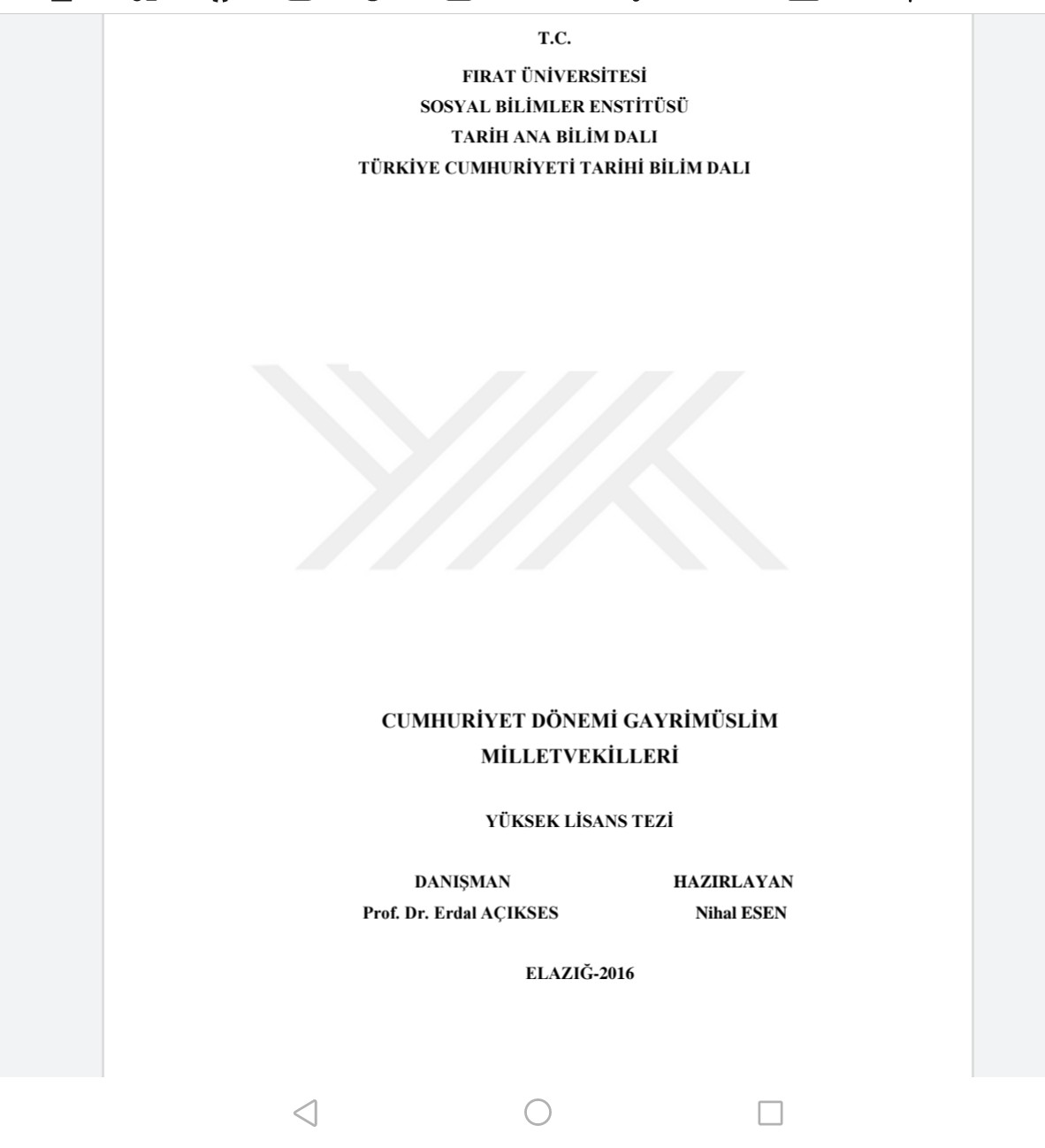 Geçen gün kaynak taraması yaptığım sırada Fırat Üniversitesi Sosyal Bilimler Enstitüsü Tarih Anabilim Dalı için Nihal Esen’in hazırladığı “Cumhuriyet Dönemi Gayrimüslim Milletvekilleri” başlıklı bir yüksek lisans tezi çalışması karşıma çıktı. Ardından da danışmanlığını Prof.Dr. Erdal Açıkses’in yaptığı ve 2016 yılında kabul edilen tezi merakla incelemeye başladım. Osmanlı’nın ardından kurulan yeni Türkiye Cumhuriyeti Parlementosunda 1920’den günümüze değin seçilmiş kentlerin, seçilmiş gayrimüslim milletvekilleri, belediye meclis üyeleri ile senatörlerin çalışmaları hakkında detaylı bilgilerin yer aldığı tezi bir solukta okudum.